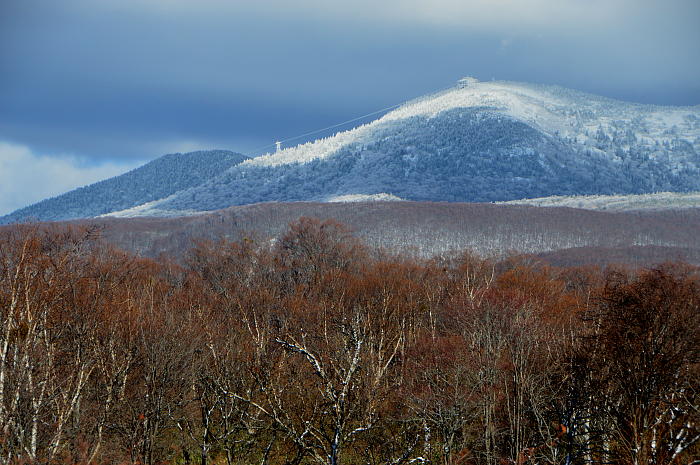 ![]() 初冬、黒石市沖揚平からの北八甲田山系の山頂付近は 冷たい雪雲に覆われていました(大画面表示) |