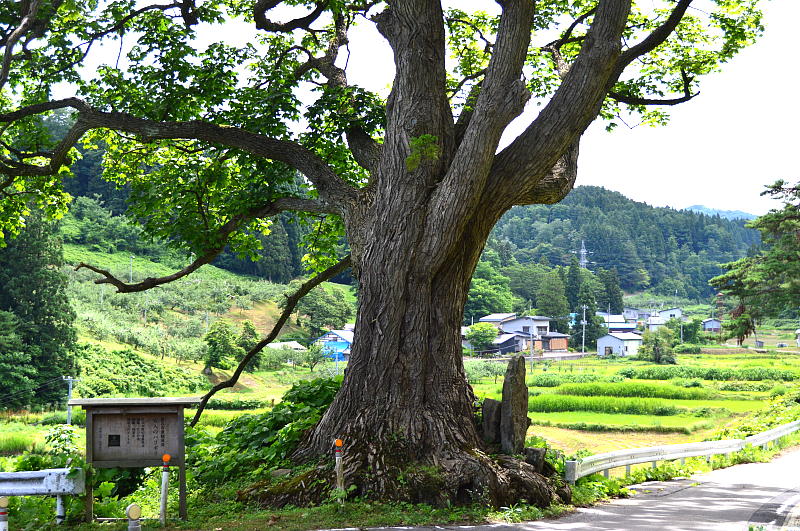![]() 集落の入り口の「樹齢約400年のハリギリ」という巨木 |