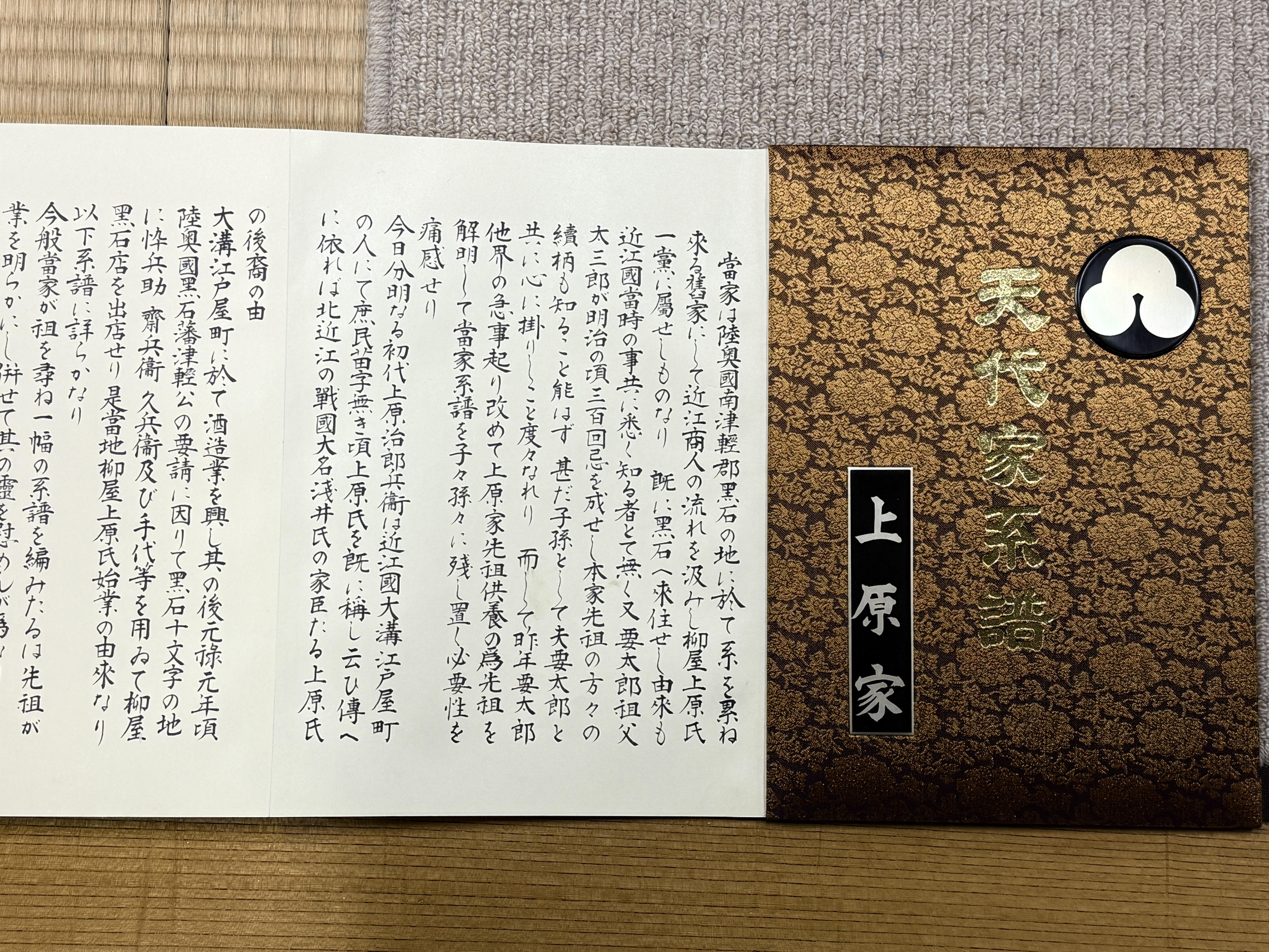 ・・・ 黒石市前町にある老舗の呉服店「上原呉服店」は大正年間に呉服商を 始めましたが、それ以前は藩政時代から酒造りを生業としていたとの事です。 上原家発祥の地は上原呉服店に残る家系図を拝見すると現在の滋賀県高島市、 ここは琵琶湖に面した古い町並みの残る地でその中心には「大溝城址」がある。 家系図には「近江國大溝町・酒造業柳屋を興す」とあります。 大溝城は織田信長の甥・信澄が築城したお城とされています。 上原家のご先祖はこの大溝の町で財をなし遠く黒石の地に酒造蔵を出店した。 近江商人はこの様にして北前船を利用して日本海側そして道南まで広範囲に その商いを地方の支店を足場にして拡大して行ったものと推察されます。 当時黒石の津軽家の発祥となった初代津軽信英公が江戸詰の旗本であったので 江戸でこの上原家と何らかの関係があって黒石への出店を決意したと思われます。 上原家は黒石にあっては屋号を「柳屋」と称し本家からの枝分かれが多くあり、 黒石における本拠地は「こみせ通り」の横町十文字一体を拠点としていた様です。 この他にも前町周辺には幾多の近江商人が店を構えていたと思われます。 ------------- Uehara Gofukuten, a long-established kimono shop in Maemachi, Kuroishi City, began trading in the Taisho era (1912-1926), but prior to that, it had been involved in sake brewing since the feudal era. According to the family tree preserved at Uehara Gofukuten, the birthplace of the Uehara family is what is now Takashima City, Shiga Prefecture. This area, facing Lake Biwa, retains its old townscape, and at its heart is the site of Omizo Castle. The family tree states, "Established the sake brewery Yanagiya in Omizocho, Omi Province." Omizo Castle is believed to have been built by Oda Nobunaga's nephew, Nobuzumi. The Uehara family's ancestors made their fortune in Omizo and opened a sake brewery in Kuroishi. It is believed that in Omi, they used the Kitamaebune shipping routes to expand their business widely, both along the Sea of West-Japan coast and in southern Hokkaido, using local branches as a base. At the time, the first head of the Tsugaru clan of Kuroishi, Lord Nobufusa Tsugaru, was a hatamoto (samurai) based in Edo, and it is believed that he had some connection with the Uehara clan in Edo and decided to open a store in Kuroishi. The Uehara clan's store name in Kuroishi was "Yanagiya," and there were many branches of the main family. Their base in Kuroishi appears to have been around the cross-road side street on Komise-dori Street. In addition to this, it is believed that many other Omi merchants had stores around Maemachi. ------------- (注)