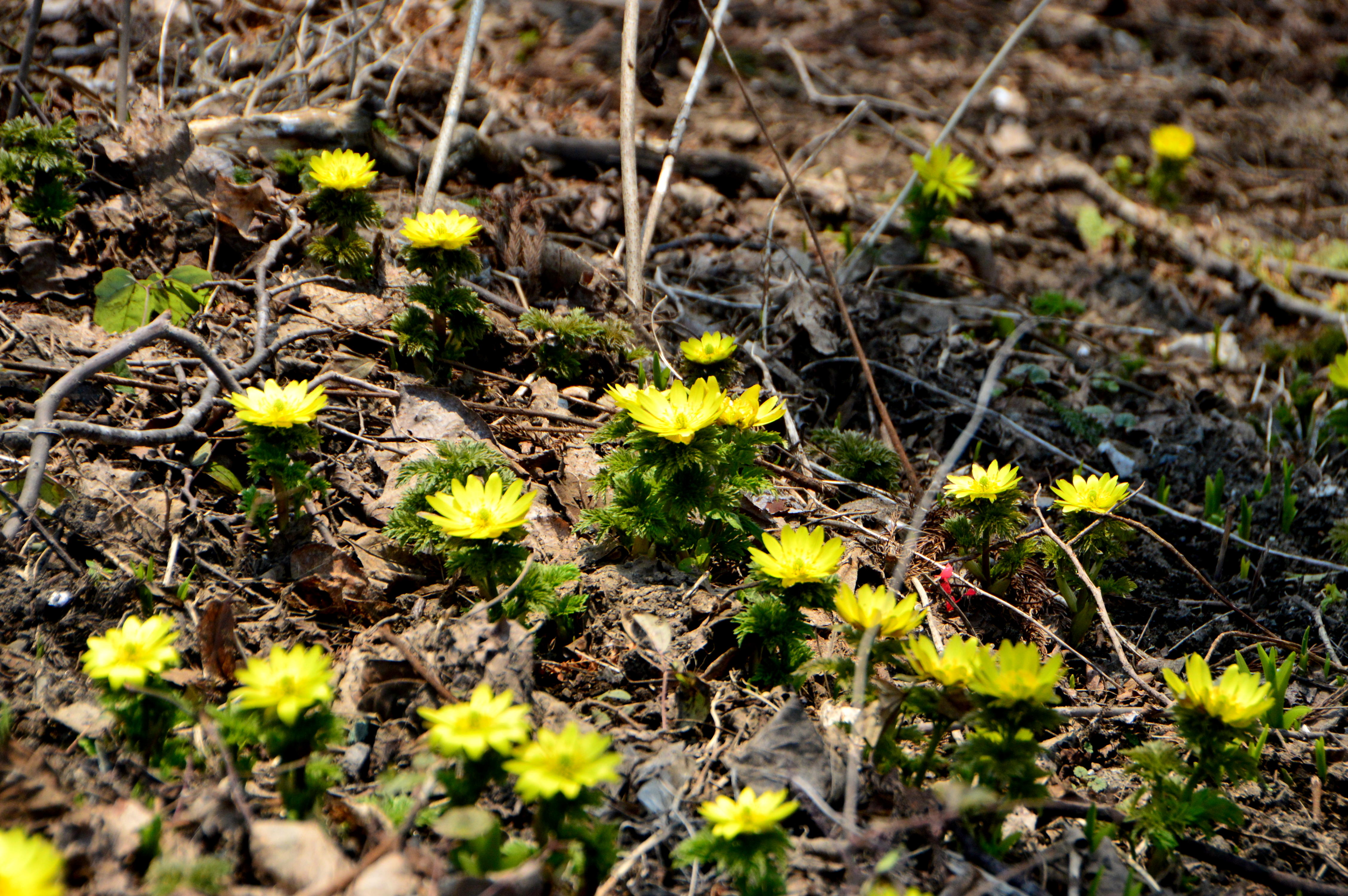 ・・・ 今年(2026年)も大川原地区にたくさんの福寿草が咲きました。 数十年前、大川原の有志の方々が「福寿草の里」を標榜して 元々学校の周辺に咲いていた福寿草を広い東斜面に植えつけて 年々その面積を増やし今日に至っています。 その間に集落の人口減少と共に小学校が廃校となりましたが 福寿草は地域住民の誇りとして大切に育てられています。 ------------- This year (2026), many Adonis amurensis flowers bloomed in the Okawara district once again. Several decades ago, volunteers in Okawara declared the area "Adonis amurensis Village" and planted the flowers, which originally bloomed around the school, on a wide eastern slope. They have increased the area year by year, leading to the present day. During this time, the population of the settlement declined and the elementary school was closed, but the Adonis amurensis flowers are cherished and nurtured as a source of pride for the local residents. ------------- (注)